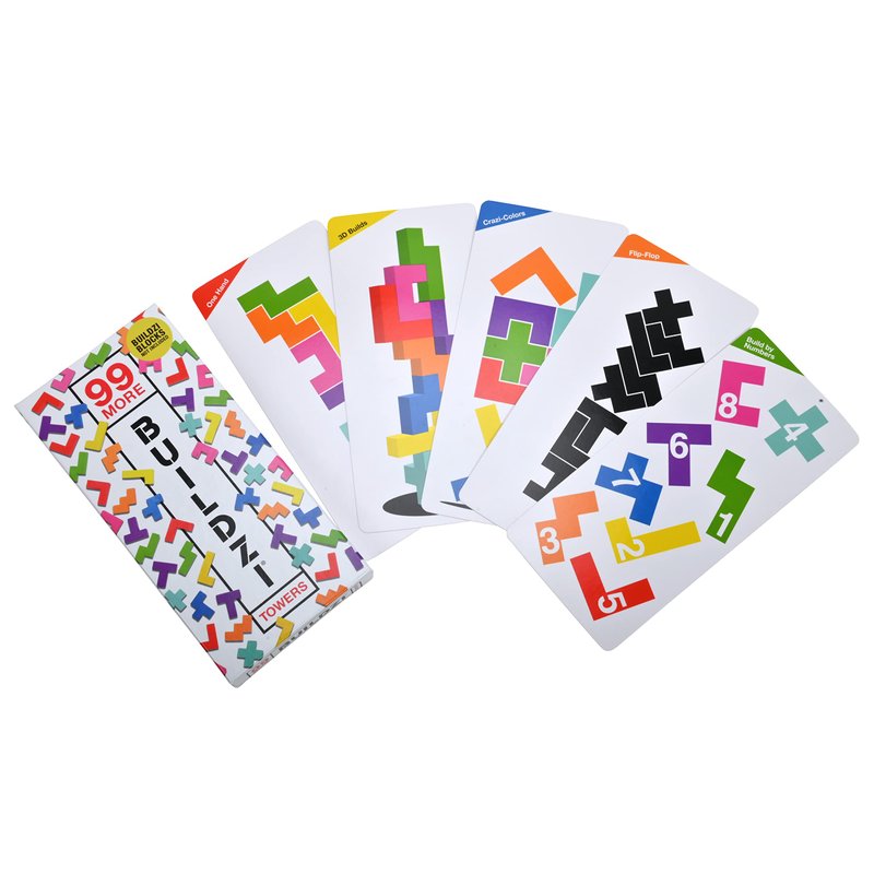 99 More BUILDZI Towers is the one of the newest creations from the duo that brought you the award-winning stacking game BUILDZI. The 5 new types of BUILDZI towers are still an easy to learn, fast paced block stacking party game that rewards creativity and quick problem solving skills. That's why BUILDZI was awarded ASTRA Best Toys for Kids in the Games 8+ category. The great thing about BUILDZI is it's extremely easy to learn and can be easily adapted for all ages and skill levels by playing it flat on a table or without racing. BUILDZI is fun because it's fast. Flip over your Tower Card or Block Card and be the first to build your block tower. Teachers love using BUILDZI for STEM activities for elementary aged kids and games for middle schoolers because it can help develop and reinforce many different skills that include fine motor skills used for stacking, spatial reasoning skills used to create a stable tower, creative divergent thinking by creating your own tower using the block cards, and building cooperative skills by working together to build a tower through cooperative play.