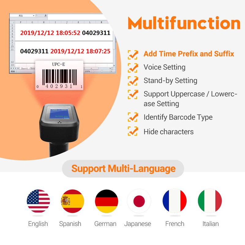 - 【LED Time Display Screen & 3-in-1 Charging Base】Exclusive led display design can show scanning status; the connection mode; the battery level; current time; barcode information; total stored barcodes. Plus it has been appearance Patent Design Certificated. Equipped with charger, stand and receiver.