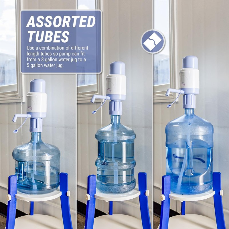 - EVERYTHING YOU NEED - All the accessories you need for using our water gallon jug dispenser are already included. Our water pump fits most 2 Gallon with our extra short upper tube. It also includes 2 different tubes, a Short Upper Tube, Long Upper Tube, Lower Tube and 2 Tube Joints for flexibility. Don't forget about the Pump Head and a Spout with a Lid to keep debris away, and cleaning brush.
