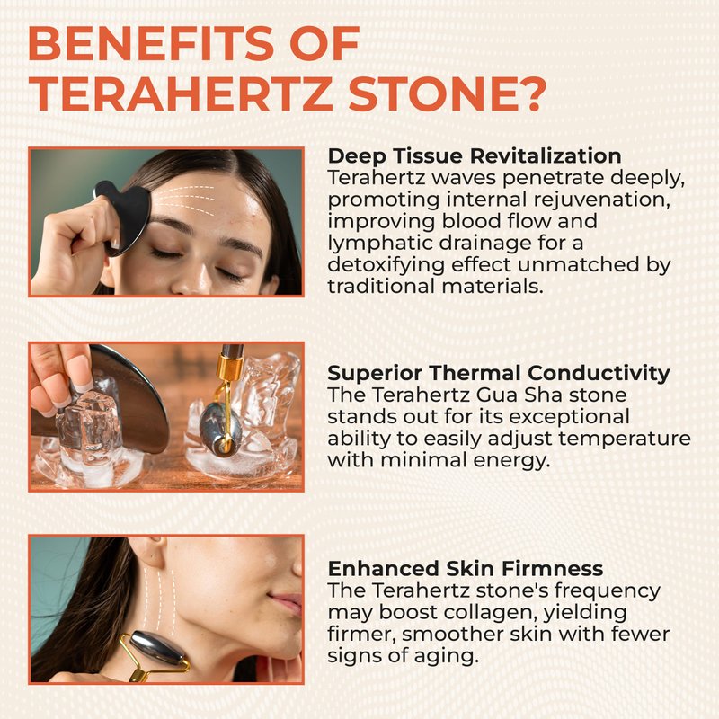 - Terahertz Gua Sha Kit – Our top-selling terahertz tools in one skincare kit! You get the facial gua sha tool and terahertz roller together. The kit is expertly designed to relieve facial tension, reduce the appearance of fine lines, and enhance blood circulation. By gently scraping the skin, it promotes lymphatic drainage and helps detoxify the skin, resulting in a smoother, more radiant complexion.