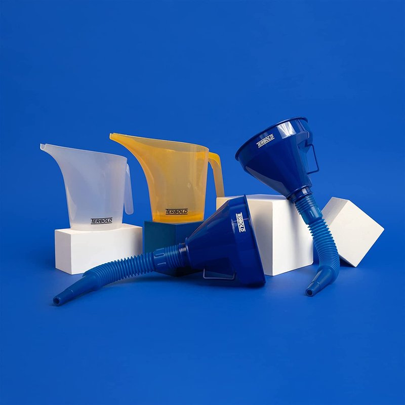 Keep your car's fluids topped up and avoid nasty spills and accidents with clean-pouring automotive funnels by Terbold. This funnel is perfect for oil changes, winter fuel changeovers, and coolant refills. Good for a shade-tree mechanic, or a professional automotive garage or rental fleet vehicle depot. Each funnel works perfectly well on its own. You can also screw on the included 9.8” flexible hose to guide the flow into hard-to-reach areas in an engine or motor. Unscrew the hose for easier cleaning and flushing to avoid cross-contamination Terbold makes its funnels from shatterproof, BPA-free plastic for your safety and peace of mind. The built-in handle on each funnel also makes it convenient to hang up on a pegboard or hang under a drip pan when collecting every drop.