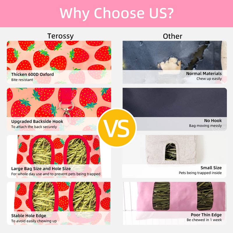 - Quality Guarantee for Durable Use: Our Terossy hay bags are designed with durable 600D Oxford cloth material, washable odorless and bite resistant (not for aggressive chewers), very healthy for your pets. The thicker 4 layers of fabric reinforced holes avoid being chewed up easily, for steadily long-lasting use and saving your money. While if you are not satisfied with the product, you will enjoy Amazon 30-day Refund and Return Service from the date of your purchase.