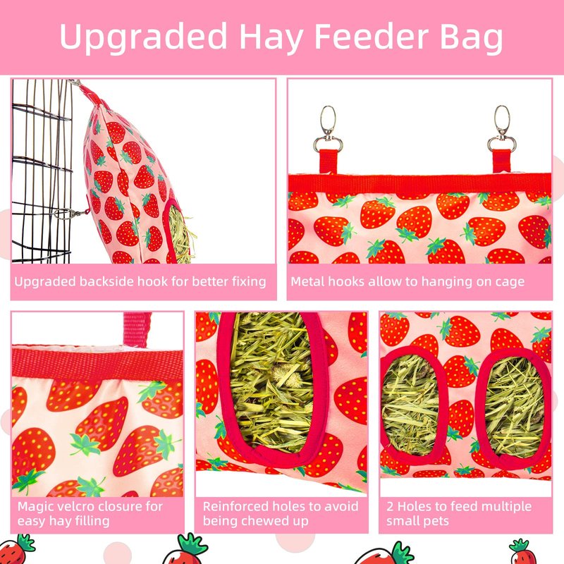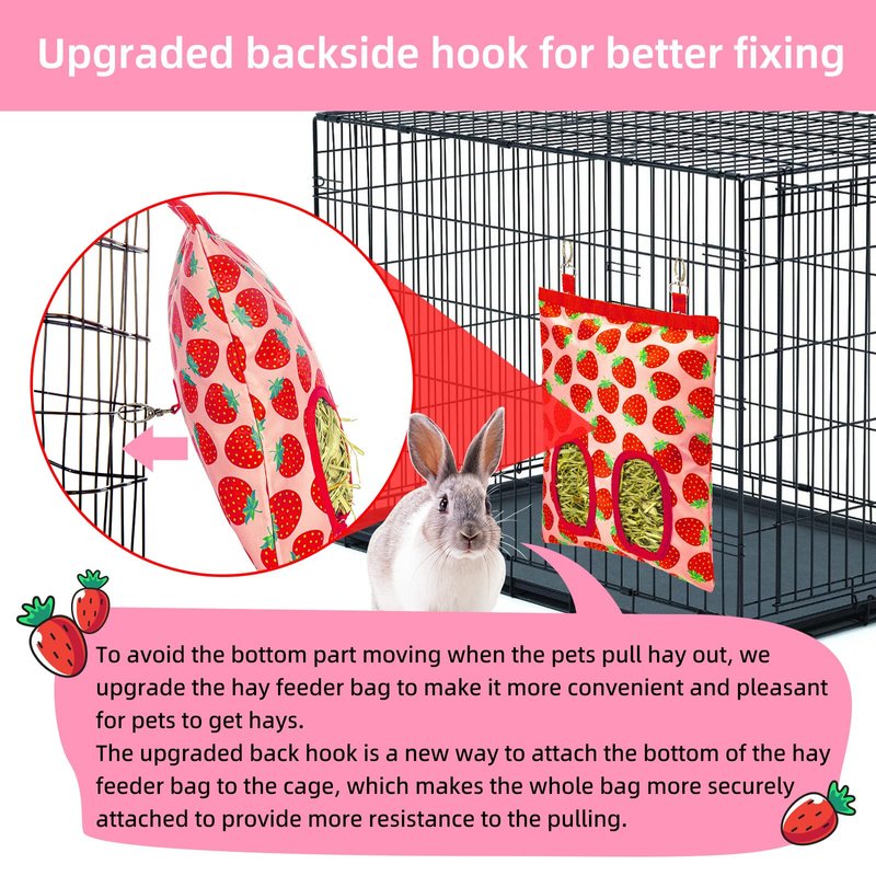 - Upgraded Practical Design: 1)Upgraded backside hook is a new way to securely attach the bag bottom to the cage, to avoid the bottom part moving when the pets pull hay out, bringing more convenient and pleasant for pets to get hays. 2)2 stainless steel hooks on top for hanging on almost any cages. 3)Large opening with magic velcro closure for easy hay filling and avoid pets entering from the top; 4)2 Reinforced holes avoid being chewed up easily, and suitable to feed one to multiple small pets.