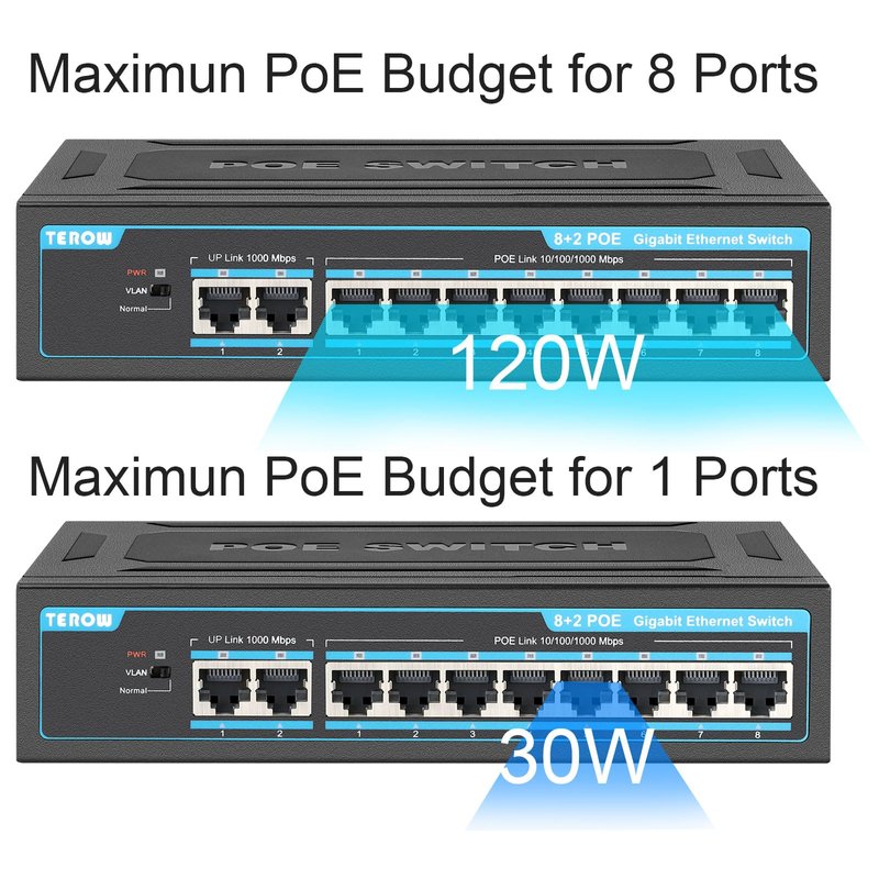 - True 8-Port PoE Switch: It comes with 2 additional Uplink ports for connecting to networks or computers, offering you a genuine 8-port PoE switch. Utilize Ethernet cables to link aggregation of over 100 ports from multiple Terow switches.