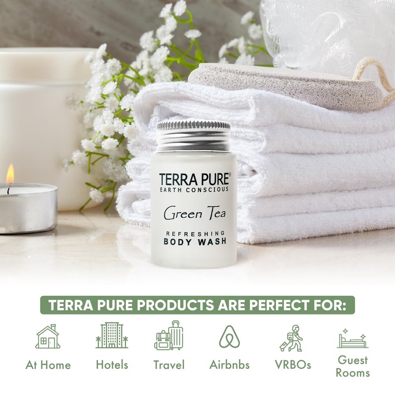- MINIMAL WASTE, MAXIMUM EFFICIENCY: Terra Pure Green Tea Body Wash is designed with vacation rental owners and Airbnb hosts in mind. Unlike classic travel size bottles of bathroom body wash that contribute to waste, our compact body wash allow you to minimize your ecological footprint.