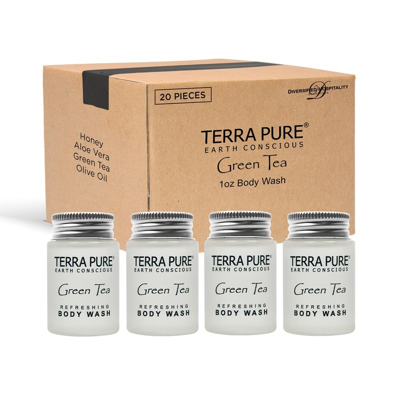 Terra Pure Green Tea Nourishing Body Wash In 1 Oz. Hospitality Size In Jam Jar Enriched With Organic Honey, Aloe Vera And Green Tea Leaves Skin Clean And Refreshed. Gluten Free And Never Tested On Animals. All of our lines were created with the environment and well-being of consumers as a top priority. We use vegetable-based formulas enriched with natural and organic ingredients. We assure the satisfaction of you and your guests with any of our lines. We are confident that you will find a collection that suits your property. Feel free to check out our below lines: - H2O Therapy - Mountain Breeze - Desert Breeze - Terra Botanics - Eco Botanics - Aqua organics - Terra Pure Green Tea - Terra Pure Wild Citrus - Island Spa - Citrus Breeze Naturals - Terra Breeze Detergents We are committed to selling products that are leading the trend in environmentally friendly production and upscale design.