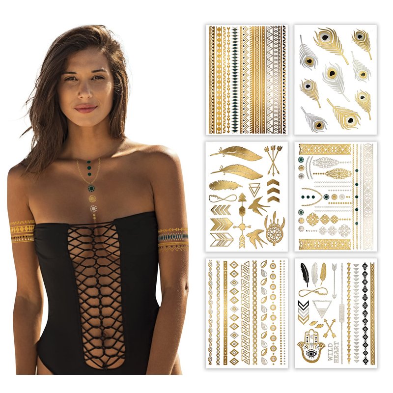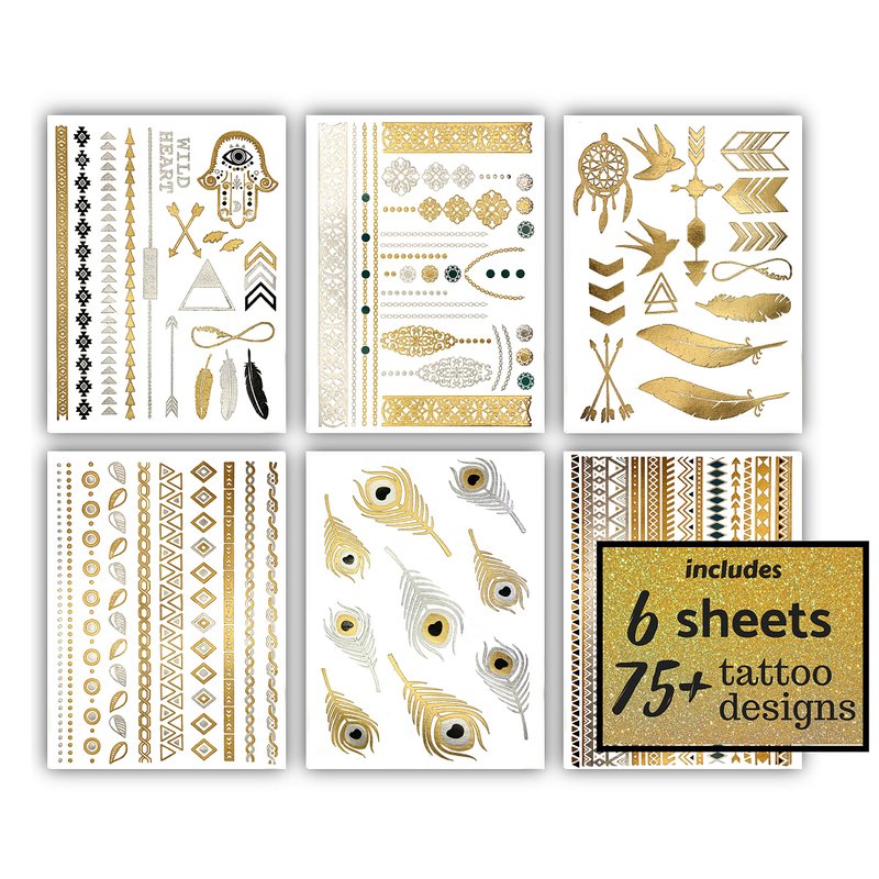 - Tons of Designs: Over 75+ tribal tattoo temporary gold metallic designs that match the vibrant images shown. Tattoo stickers for women are perfect for festivals, concerts, vacation or a simple way to get creative with your look! Designs include feathers, arrows, birds, dream catcher, jewelry designs & tribal inspired arm bands. These shimmering glitter tattoos for girls can be body tattoos, face tattoos, arm tattoos & more.