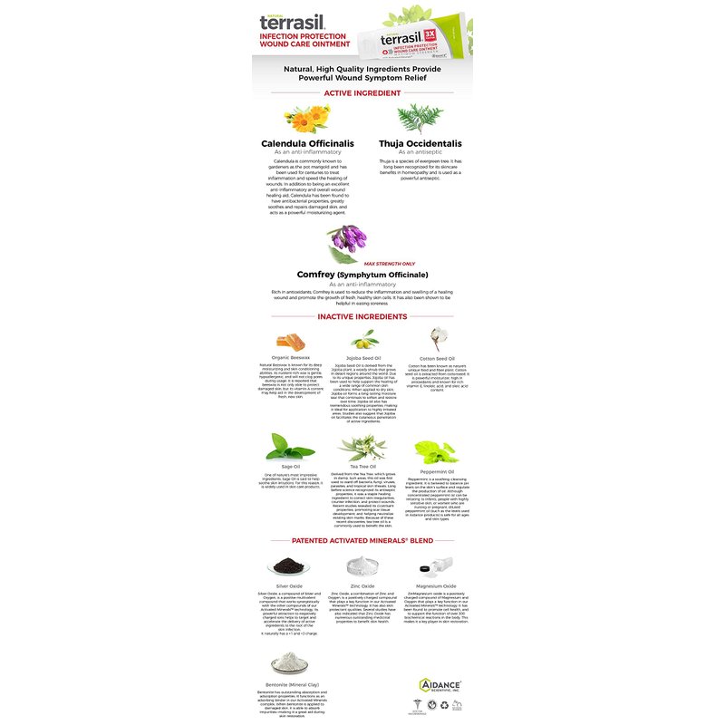 Terrasil Wound Care is a soothing, natural antiseptic ointment that kills bacteria and promotes faster healing of wounds, ulcers, burns, cuts, blisters and sores. Featuring patented activated minerals technology that delivers fast, targeted relief with the finest natural ingredients.