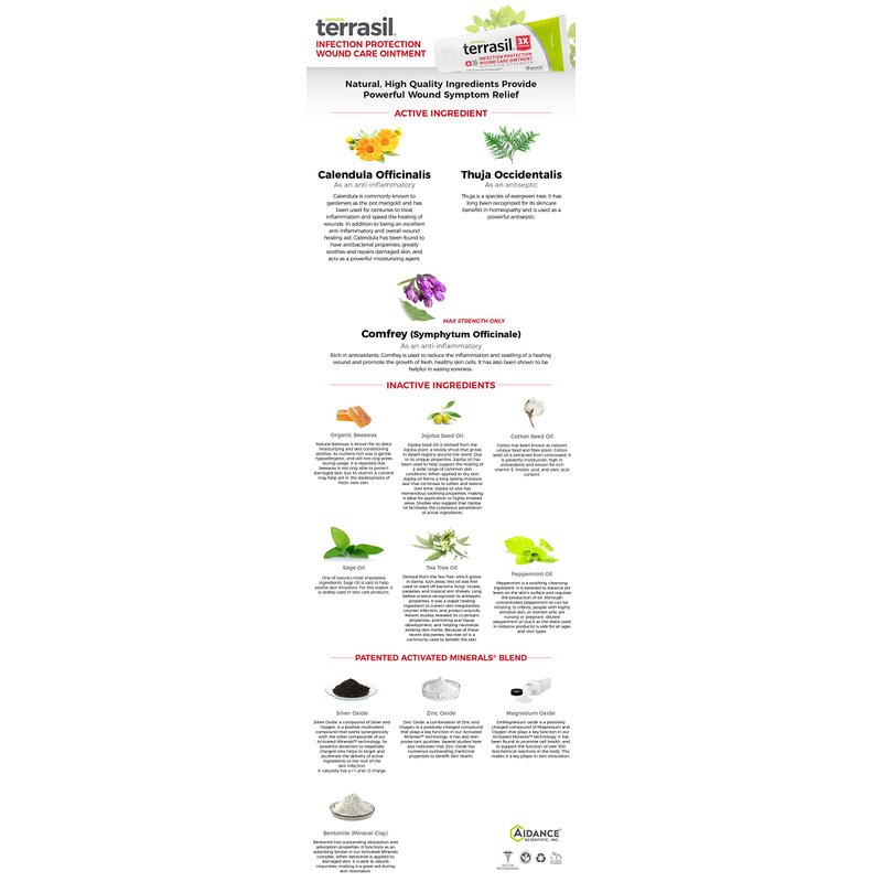 Terrasil Wound Care Max is an enhanced soothing, natural antiseptic ointment that provides faster healing of wounds, ulcers, burns, cuts, blisters and sores. Featuring patented activated minerals technology that delivers fast, targeted relief with the finest natural ingredients.