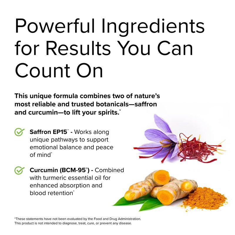 Discover the serene blend of saffron and curcumin with this Terry Naturally premium supplement. Specially crafted to support a positive outlook, this herbal supplement is perfect for those who want to support a sense of calm. Our unique combination of curcumin and the essence of saffron works in synergy to aid the body's processes that contribute to a positive outlook.*