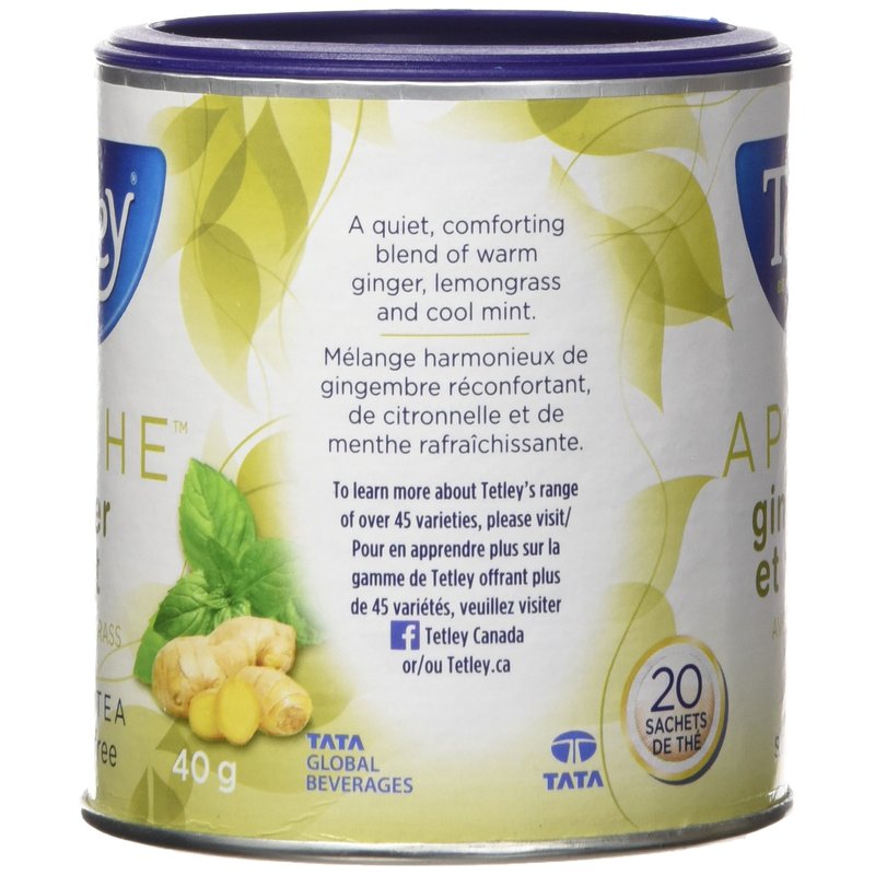 Tetley tea has been around since 1837. Try some of this Soothe Ginger Mint with Lemongrass Herbal Caffeine free Tea. Herbal Tea. Caffeine Free. 20 Round Tea Bags. Kosher. Imported from Canada
