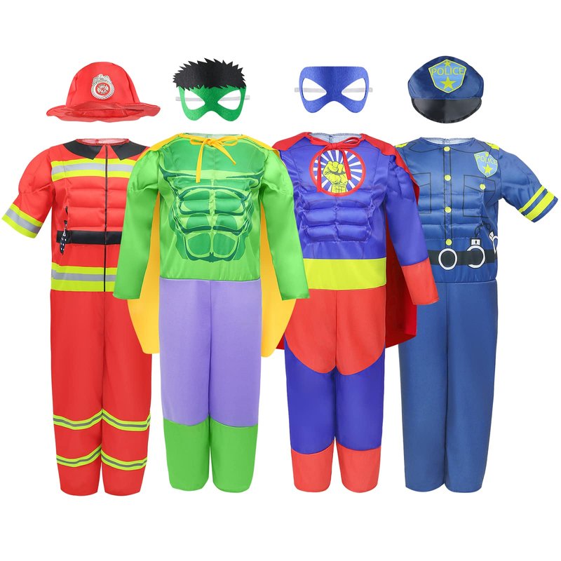 Teuevayl Boys Muscle Chest Dress up Costumes Set Trunk with Superhero, Policeman, Fireman, Kids Pretend Role Play , Boys Dress up Clothes for Kids Ages 4-7