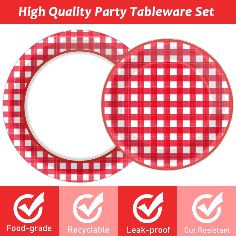 - 【Red Gingham Party Supplies Serves 24】These red & white gingham party supplies set includes: 24 plates (9inch) + 24 plates (7inch) + 24 napkins (13inch) + 24 forks, there are a total of 96 pieces in this set, which will add fun to any theme party