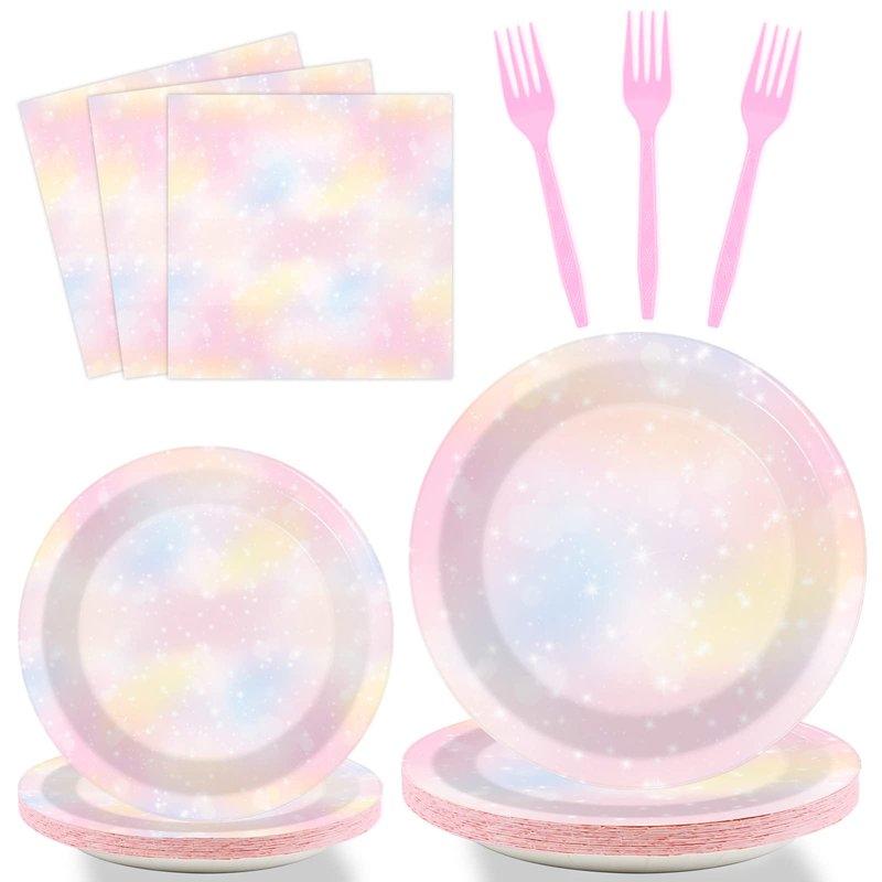 - 【Rainbow Party Supplies Serves 24】These rainbow party supplies set includes: 24 plates (9inch) + 24 plates (7inch) + 24 napkins (13inch) + 24 forks, there are a total of 96 pieces in this set, which will add fun to any theme party