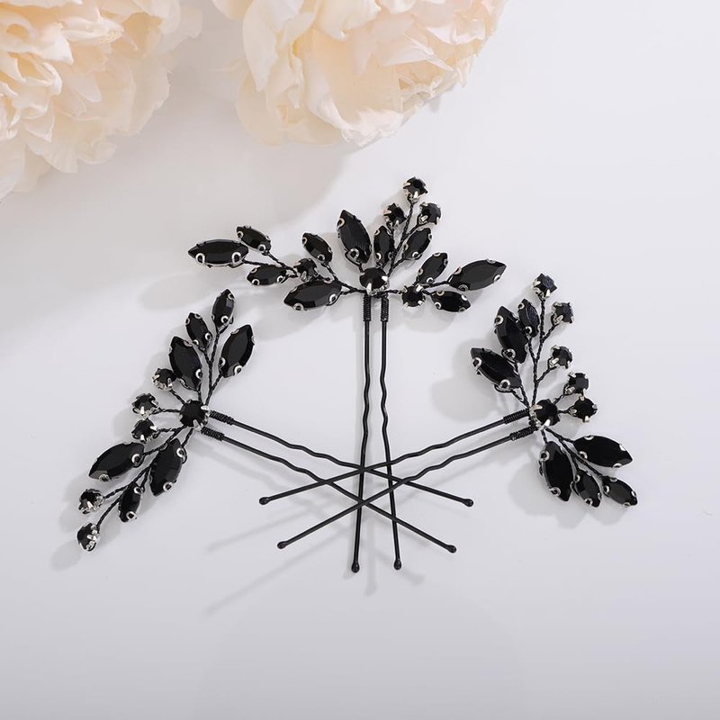 Teyglen 3pcs Black Rhinestone Hair Pins Set - Handmade Crystal Hair Pieces and Accessories for Bride, Women, and Girls