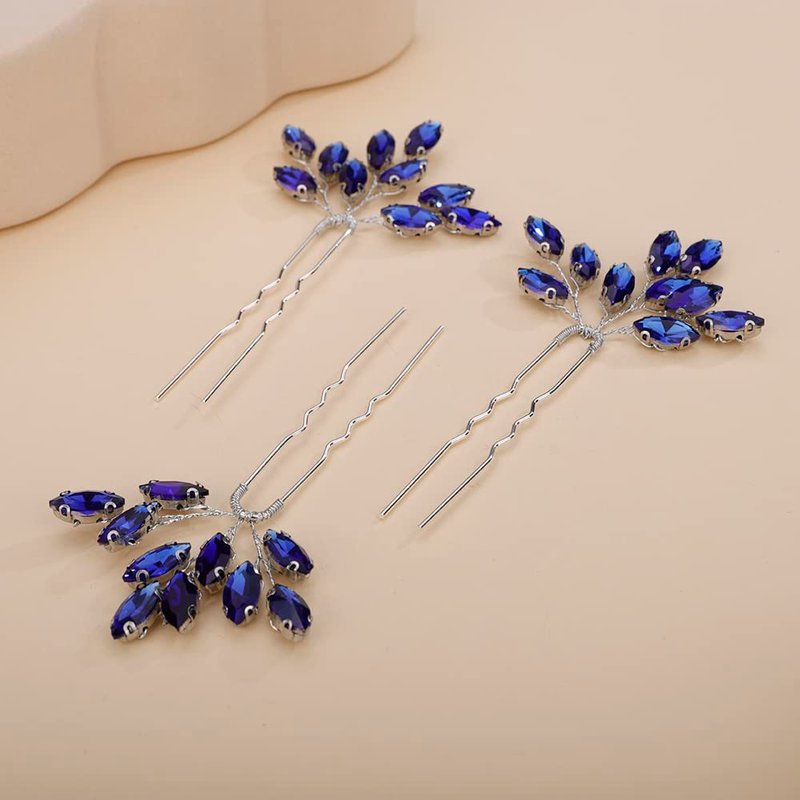 Teyglen 3pcs Bridal Crystal Hair Pins Rhinestones Hair Pieces Simple Crystal Wedding Hair Accessories Handmade Hair Pins for Women Bride Girls (Blue)