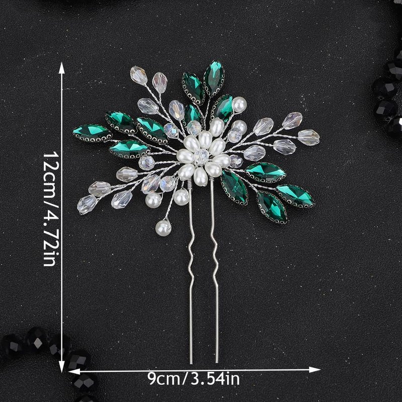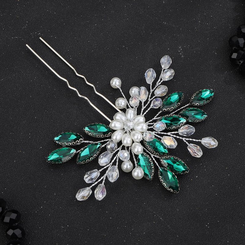 Teyglen Flower Bridal Hair Pin Crystal Flower Wedding Hair Piece Handmade Green Rhinestone Pearl Beads Hair Pins Clips Vinatge Headpiece Floral Hair Accessories for Women Bride Girls