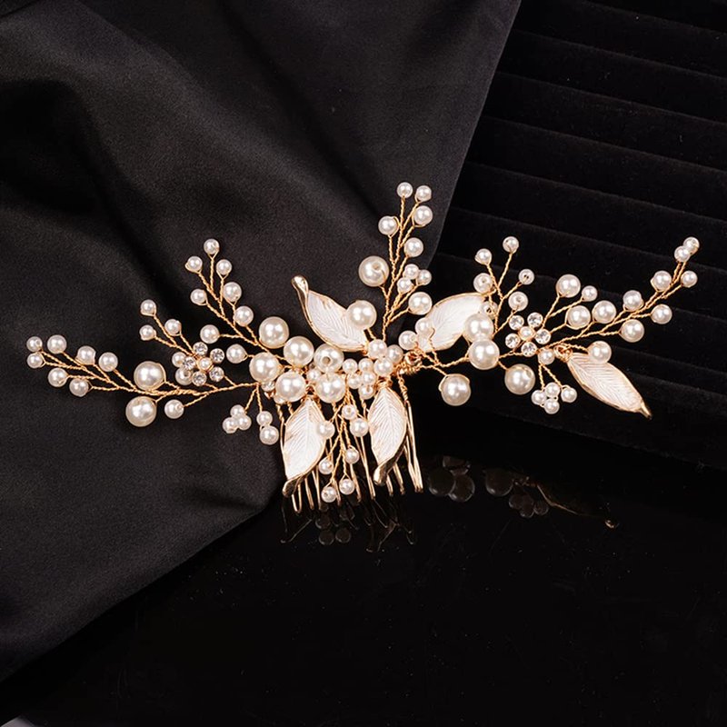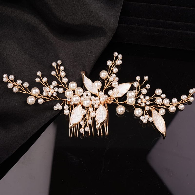 - Wedding Bridal Gold Leaf Pearl Hair comb for Women Wedding Party Prom.