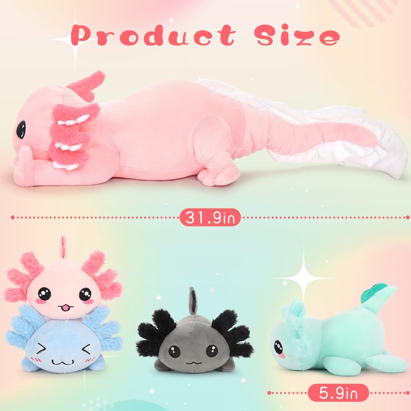 - Multifunctional&Gifts: This axolotl plushie is not only a great decorative toy for bed, sofa, chair, desk or couch, but also a nice huggable axolotl body pillow for sleeping. Adults can release stress when huging the soft pillow. It's also a warm playmate to accompany kids grow up. Just give the sweet gift to your loved ones on Christmas, Halloween, Valentine's Day, Children's Day, Easter, Thanksgiving, New Year, or birthday.