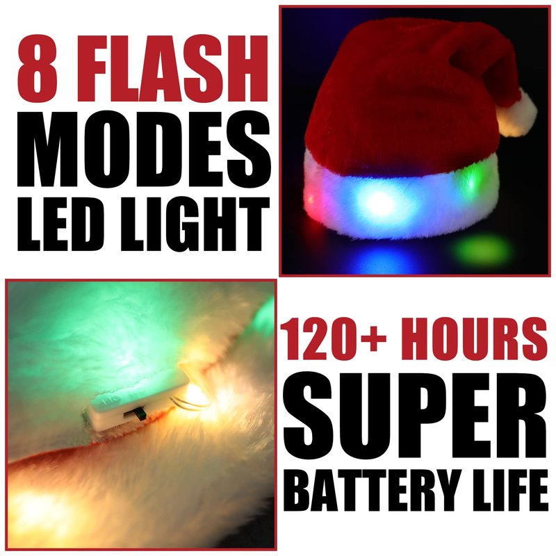 - 🎅🎅【Bright LED Light】Our Santa hat has 8 colorful LED lights, 8 flash modes, and more than 120 hours of ultra-long battery life. Just simply turn on the switch and this Unique sparkling Santa hat will light up your Christmas party.Your kids will fall in love with this hat.