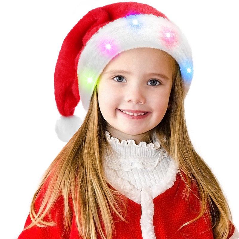 - 🎅🎅【Universal Size】Our Christmas hat with lights is 11.8 x 15 inches in size, suitable for kids under 8 years old. This Christmas hat is made of high-quality plush. The soft and comfortable fabric has a strong warmth retention property, keeping your kids warm in the cold winter. Well for indoors and outdoors.