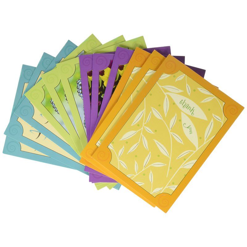 This box of 12 thank you cards is produced by Designer Greetings and is blank on the interior. Each card measures 5x7 inches and is printed on heavy cardstock. The set includes 12 cards and 13 envelopes. The cards have the following special features: embossed, gold foil. This assortment of 12 gold foil and embossed thank you cards features flowers, butterflies and simple colorful illustrations. Each card is printed on heavy cardstock and measures 5x7 inches. The assortment includes 12 cards (3 each of 4 designs) and 13 envelopes. Box size: 7 3/4 x 5 5/8 x 1 1/4 inches.