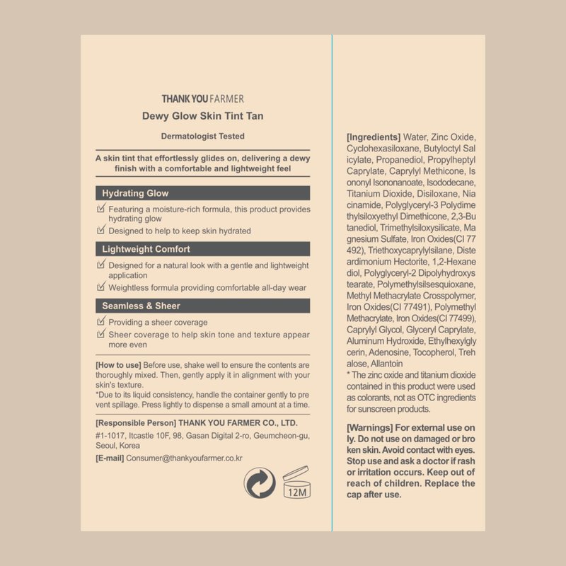 THANK YOU FARMER Dewy Glow Skin Tint, Long-Lasting Tinted Moisturizer, Light coverage, Vitamin B3, Niacinamide, Adenosine, Korean Beauty Dermatologist Tested, Tan, 1.75 fl oz