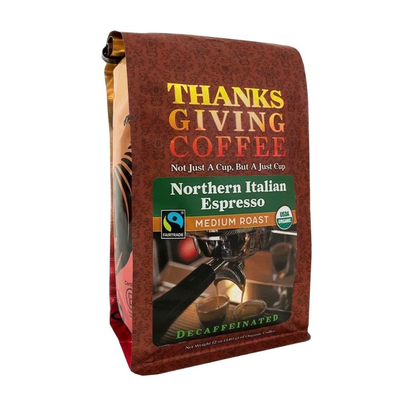 Thanksgiving Coffee "Northern Italian Style Espresso - FTO Decaf" Medium Roasted Fair Trade Organic Whole Bean Coffee - 12 Ounce Bag