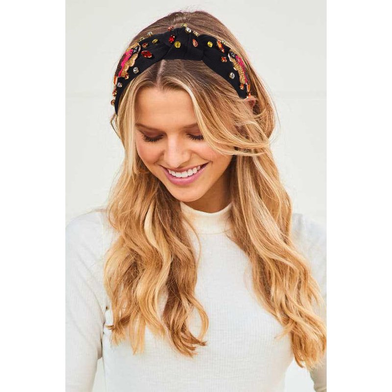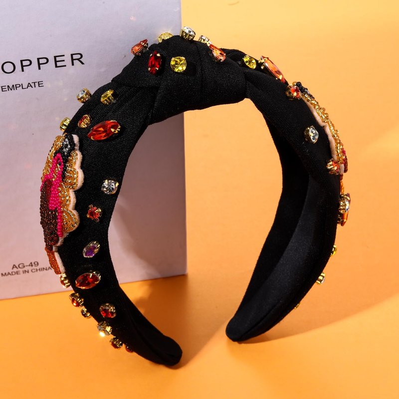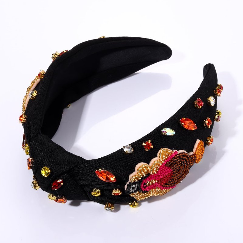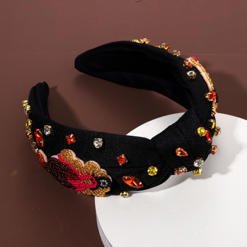 This fall headband is the perfect Thanksgiving accessories to enhance a strong sense of holiday atmosphere. Features black top knot headband with turkey/maple leaf beadwork, adorned with rhinestones, pearls and gold beads.