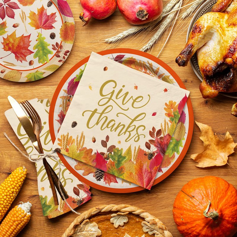 - Serve up classic napkins in fabulous fall! This fall thanksgiving napkins designed with colorful leaves, acorns and wheat. It feature a golden "GIVE THANKS" headline. Mix and match our fall leaves collections to create a festive seasonal.