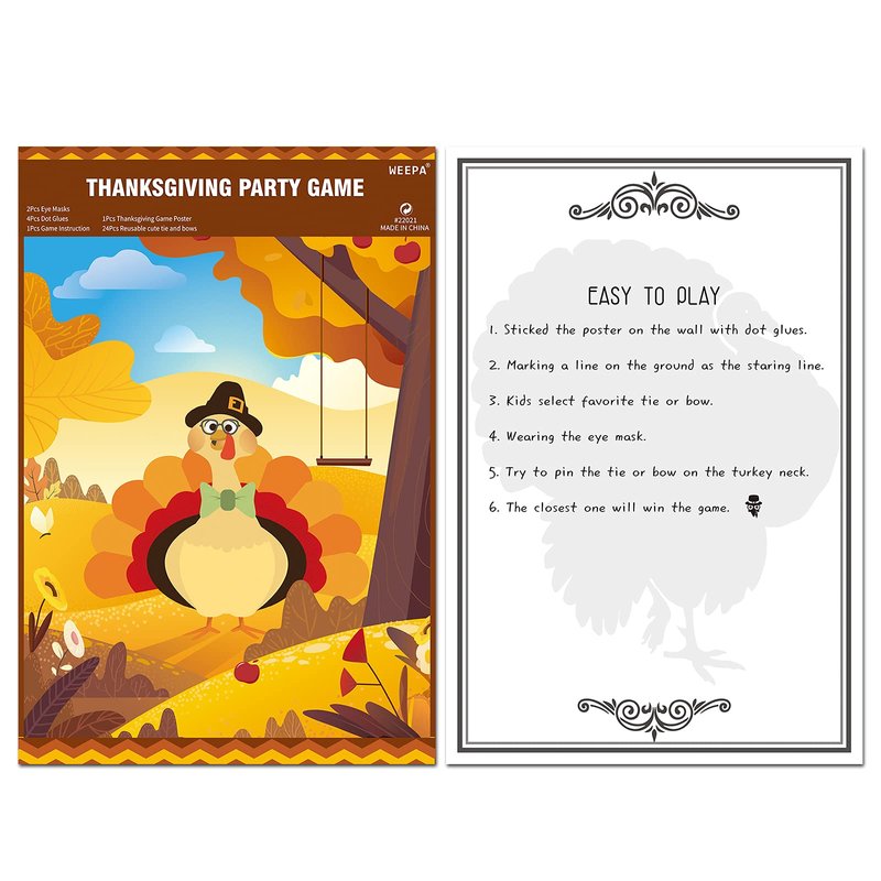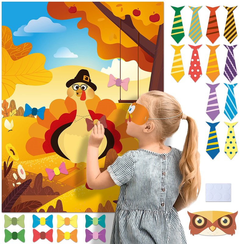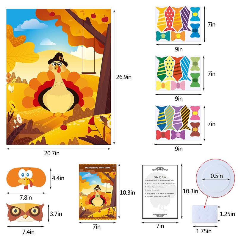 - Pin the Tie on the Turkey Package: 1 pc Pin the Tie on the Turkey Game poster, 1 pc orange turkey eye mask, 1 pc brown owl eye mask, 24 pcs reusable tie and bow stickers, 6 pcs dot glues and 1 pc pin the tie on the turkey party game instructions. Perfect for Thanksgiving party games, Thanksgiving party decorations, Thanksgiving birthday party, autumn decorations, fall decor, classroom party game activities.