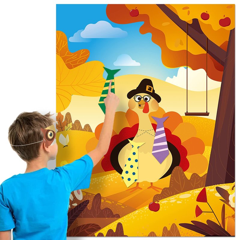 Thanksgiving Party Games Pin the Tie on the Turkey Pin the Tie on the Turkey game is a great gift for kids to use in the Thanksgiving day, classroom party and more. It will bring a huge hit to their parties and all guests will enjoy with Thanksgiving game. Come and play with your child!