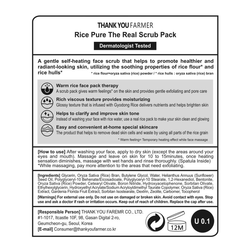 THANKYOU FARMER Rice Pure The Real Scrub Pack, Korean Facial Scrub, Vegan, Self-heating Formula, Special Home-spa, Gentle Exfoliating Face Scrub, Dermatologist Tested, 3.51 fl.oz (100ml)