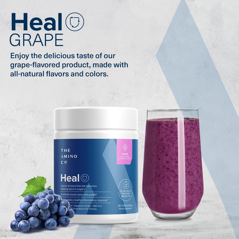 - Optimize Your Fitness: Amino Co Heal powder supports muscle development and boosts endurance. Post workout blends, with grape flavor and added sweetener, offer a wholesome approach to optimize your fitness journey.