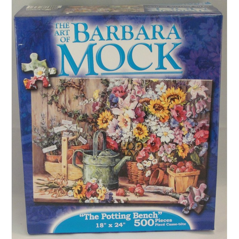 - Pretty picture features a potting bench with watering can, pots, and surrounded by a variety of beautiful flowers and fruit.