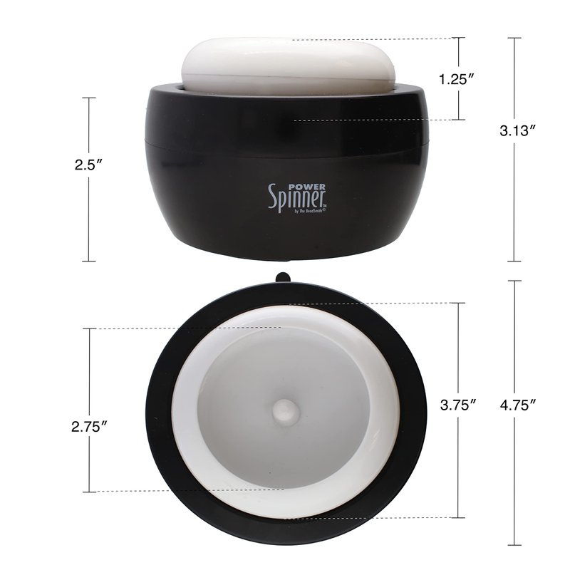 - MOTORIZED: The Power Spinner plastic base measures 2.25 x 4.5 x 7.5” and spins at an even speed (2 AA batteries required). Included are 3 spinning cups, 1.75 x 4”, with snap on lids and 2, 4-inch J-hook needles. There are printed and illustrated instructions on the side of the box.