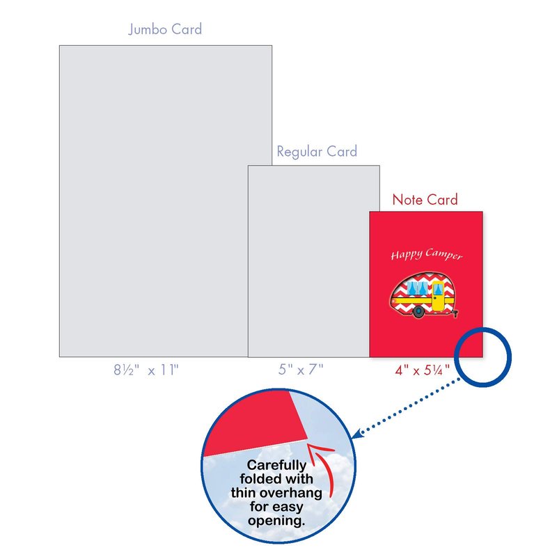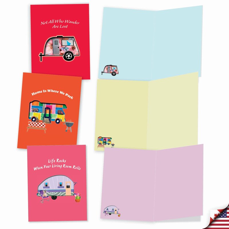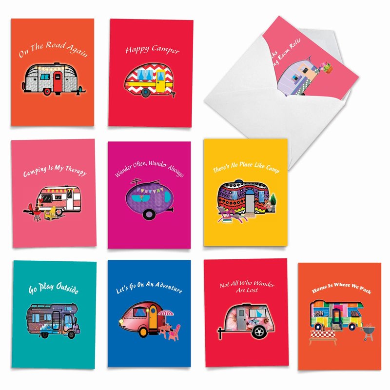 Greet friends and loved ones with this hip and trendy stationery card bundle. A special ungreeted set that is designed for people who love camping and the great outdoors. This 10 card set features an assortment of cute designs of various camper vans and trailers. If you are looking for a trailer-themed notecard, then this one's for you! Order this boxed card set today and wish someone a Happy Birthday! Thinking of a nice way to tell someone you miss spending time with them? Look no further than this awesome card set. There is a colorful camper van design for everyone. Regardless of age or gender, your recipients will surely love and appreciate this cool bundle. Perfect for people who love sending out greeting cards. Our good as gold cards are printed on thick, snow white cardstock. All of our all-occasion note cards are made of recycled material (not papyrus, naturally). Our print on demand technology further reduces paper waste and environmental impact. The high gloss cover photo pops with quality and color, while the inside is matte, creating a smooth writing surface for your heartfelt notes. This year, reach friends, family, and business coworkers living near or far, as every greeting card ships with a mailing envelope. Bulk notecard assortments and sets arrive in a reusable box. All assorted cards for kids and parents are easily stored in an office desk, ready to customize for your next life occasion. This year, leave a big impression on your recipients. These all occasion cards are great for birthday gifts, thank yous, and hello cards. There are beautiful designs, and funny greetings, waiting for you!