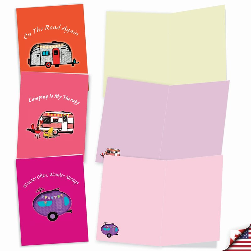 The Best Card Company - 10 Blank Note Cards Boxed (4 x 5.12 Inch) - All Occasion Notecards, Vehicles and Cars - Happy Campers AM6413OCB-B1x10