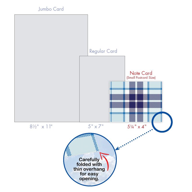 We offer a huge 8.5 x 11-inch jumbo size version of most of our designs and assortment packs of our most popular designs in just about any occasion and configuration. We also publish blank versions of many designs and assortments to be used as thank you notes, friendship, miss you, thinking of you or any other purpose or occasion you can think of.