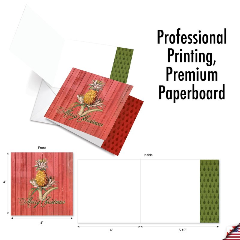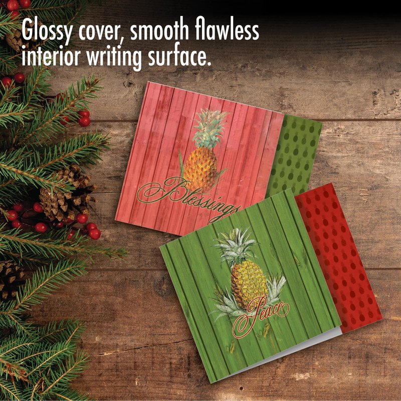 Looking for a tropical themed card? Do you have friends or family that live in a warm country where the sun shines all year round? Where fruits like pineapple is part of the x-mas celebration? Perhaps those people live near the beach or have a nice big farm? This card might be a good match for what you need, featuring a ripe yellow pineapple ready to be harvested, a symbol of abundance and gratitude for the blessings that have been bestowed upon us. The red wooden background a nice touch to give the card its holiday feel. Go ahead and order this 10-piece card pack now and make your loved ones feel appreciated and thought of. Include a nicely written greeting inside since there is so much space to make it memorable and special. May we all have a wonderful x-mas season. Our good as gold cards are printed on thick, snow white cardstock. All happy holiday notecards are made of recycled material (not papyrus, naturally). Our print on demand technology further reduces paper waste and environmental impact. The high gloss cover photo pops with quality and color, while the inside is matte, creating a smooth writing surface for your heartfelt, joyful Christmas notes. This Christmas season, reach friends, family, and coworkers living near or far, as every greeting card ships with a mailing envelope. Bulk notecard assortments and sets arrive in a reusable box. All boxed notecard sets are easily stored in a work office desk, ready to customize for your next life occasion. Some card designs and photos even look great framed, creating appealing wall art for your home. This year, leave a big impression on your recipient, no matter the occasion. There are beautiful designs, and funny greetings, waiting for you!