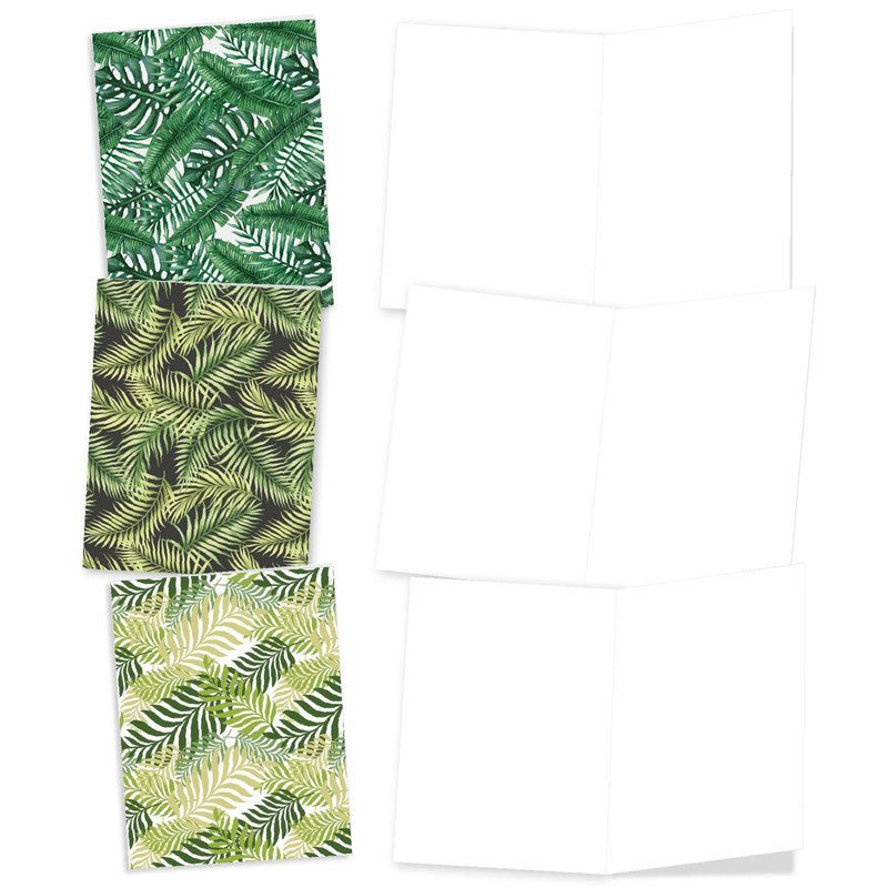 - 10 BLANK NOTE CARDS - Inside text is blank with no greeting. These cards are decorated with 10 different tropical leaf patterns. If you're about to head out on a tropical vacation, or you're looking for a way to bring the sunshine to your friends and family, then these cards are for you. Blank inside for your personalized greetings or inspirational quotes. Ships with envelopes and reusable box.