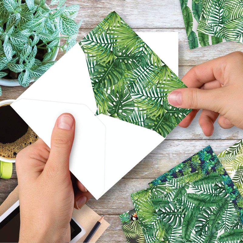 TROPICAL CANOPY NOTE CARD SET Luscious green leaf patterns adorn these 10 unique note cards. Add a tropical flavor to all the birthday wishes, thank yous, and holiday greetings you write. Fill these blank cards with personalized messages that are sure to warm the hearts of your loved ones. Write your special notes with confidence on our durable, top-quality, US-made stationery. PREMIUM QUALITY AND DESIGN These small cards are an assorted stationery note set. This is part of a larger collection that spans a broad range of motifs, from traditional themes to contemporary graphics to vintage art – there's something for everyone! Our cards are printed on-demand on thick, bright, premium recycled paper. Many of the designs are available in both greeted and blank versions. Known for our funny cards and what has been described at times as snarky humor. We proudly print all our products in North America - USA and Canada (of all places)! Every card is printed to-order and on demand, eliminating waste & obsolete inventory. No matter what the product assortment is, we strive for perfection - every card, every order, every time.