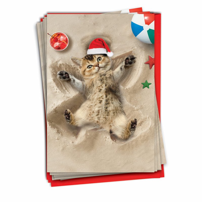 Send sweet Christmas greetings to all your friends and loved ones with this adorable, kitten themed Merry Christmas card. A fun and festive tropical themed card featuring a cute kitten enjoying her day on the beach. This unique design is made specially for people who love the sand and surf. A favorite Christmas destination for people living in tropical countries. This is a must have card bundle if you have plenty of friends who love the seas. 12 premium cards in one boxed bundle lets you wish all your close friends a Merry Christmas! Simply pen a heartfelt and sincere greeting with a personalized message to complete this. Order today and receive this 12-card bundle boxed with envelopes for your convenience! Our good as gold cards are printed on thick, snow white cardstock. All happy holiday notecards are made of recycled material (no papyrus, naturally). Our print on demand technology further reduces paper waste and environmental impact. The high gloss cover photo pops with quality and color, while the inside is matte, creating a smooth writing surface for your heartfelt, joyful Christmas notes. This Christmas season, reach friends, family, and coworkers living near or far, as every greeting card ships with a mailing envelope. Bulk notecard assortments and sets arrive in a reusable box. All boxed notecard sets are easily stored in a work office desk, ready to customize for your next life occasion. Some card designs and photos even look great framed, creating appealing wall art for your home. This year, leave a big impression on your recipient, no matter the occasion. There are beautiful designs, and funny greetings, waiting for you! Many family friendly options, including cute and adorable art for kids, adorn our greeting card covers.
