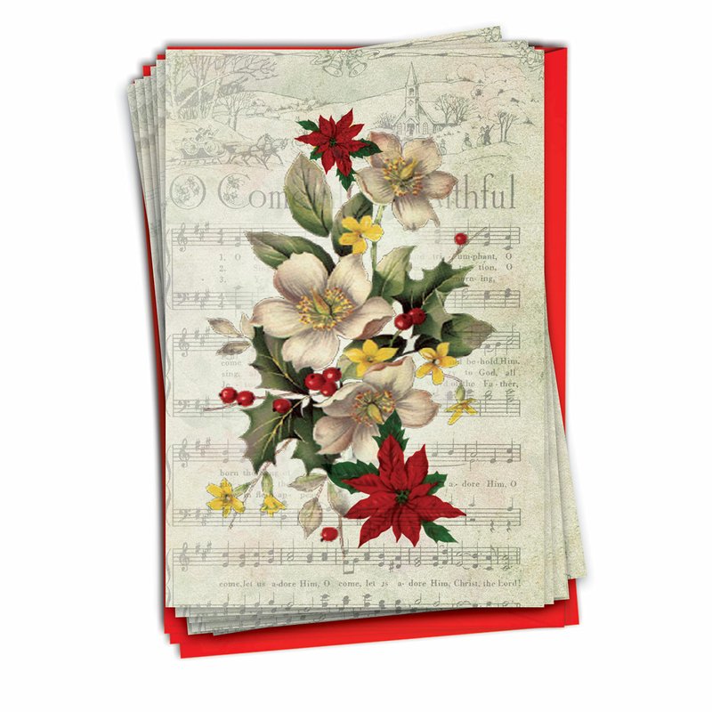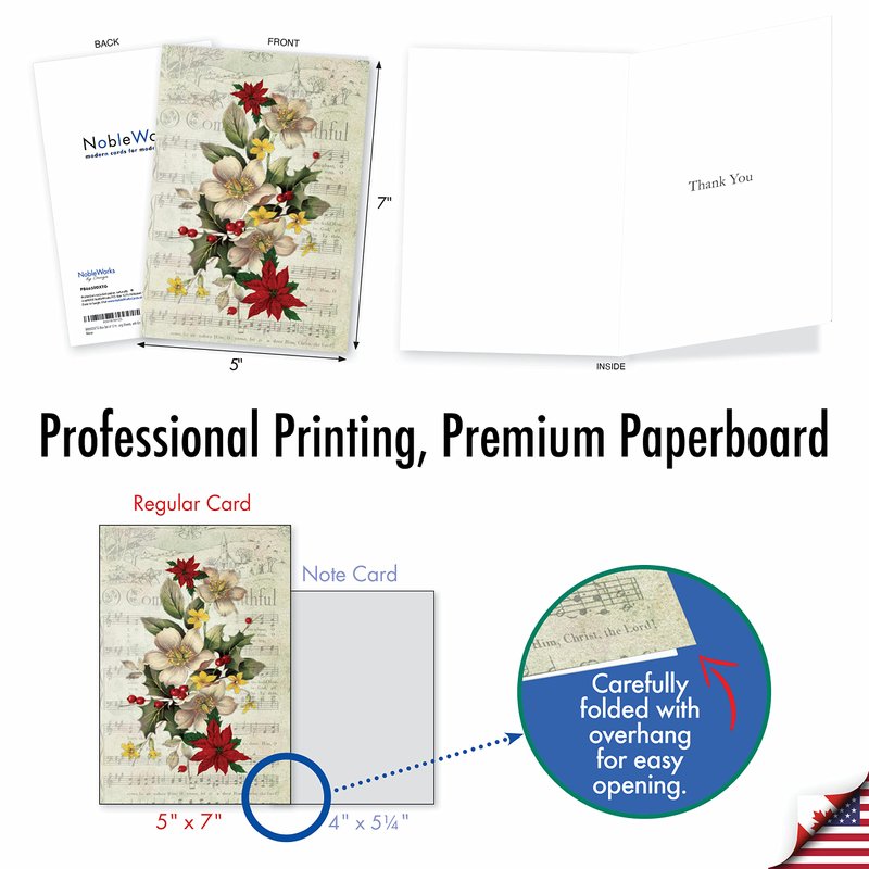 This holiday, celebrate the season with some music and dance with our holly notes theme card, featuring a beautiful bundle of white flowers mixed with some red poinsettia and red berries, the arrangement giving that serene and traditional feeling of a nice and happy season. The background of the card is a faded musical sheet with notes on the classic tunes sang during this time. It also features a horse drawn carriage on its way to the village where happy people await its arrival. Order this 12 piece card pack now, and spread some cheer and joy to all your friends and family members. Include a nice heartfelt hand written note inside the card to make this present a memorable one. Happy Hanukkah to one and all! Our good as gold cards are printed on thick, snow white cardstock. All happy holiday notecards are made of recycled material (not papyrus, naturally). Our print on demand technology further reduces paper waste and environmental impact. The high gloss cover photo pops with quality and color, while the inside is matte, creating a smooth writing surface for your heartfelt, joyful Christmas notes. This Christmas season, reach friends, family, and coworkers living near or far, as every greeting card ships with a mailing envelope. Bulk notecard assortments and sets arrive in a reusable box. All boxed notecard sets are easily stored in a work office desk, ready to customize for your next life occasion. Some card designs and photos even look great framed, creating appealing wall art for your home. This year, leave a big impression on your recipient, no matter the occasion. There are beautiful designs, and funny greetings, waiting for you!