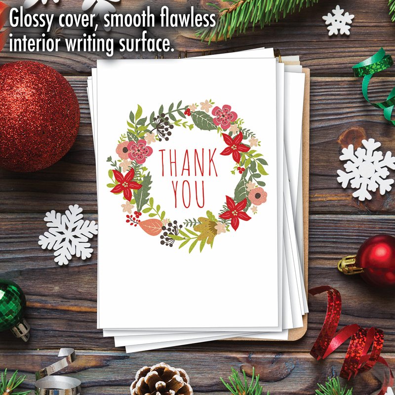 Express genuine appreciation messages and sentiments to everyone with this elegant, Christmas appreciation card. This 12-pack appreciation card set features a beautiful, floral design with a simple "Thank You" note. Cute and colorful, perfect for men and women of any age and gender. Make your appreciation felt with a sincere, handwritten message. Tell everyone how much you appreciate all the love and support that they have given you in this year filled with difficulties. The inside of this card is blank letting you personalize it for different occasions. Thank a friend for helping you pack your things. Thank an officemate for helping you finish a report. Whatever the reason, your recipients will surely feel extra special when they get this. Our good as gold cards are printed on thick, snow white cardstock. All happy holiday notecards are made of recycled material (no papyrus, naturally). Our print on demand technology further reduces paper waste and environmental impact. The high gloss cover photo pops with quality and color, while the inside is matte, creating a smooth writing surface for your heartfelt, joyful Christmas notes. This Christmas season, reach friends, family, and coworkers living near or far, as every greeting card ships with a mailing envelope. Bulk notecard assortments and sets arrive in a reusable box. All boxed notecard sets are easily stored in a work office desk, ready to customize for your next life occasion. Some card designs and photos even look great framed, creating appealing wall art for your home. This year, leave a big impression on your recipient, no matter the occasion. There are beautiful designs, and funny greetings, waiting for you! Many family friendly options, including cute and adorable art for kids, adorn our greeting card covers.
