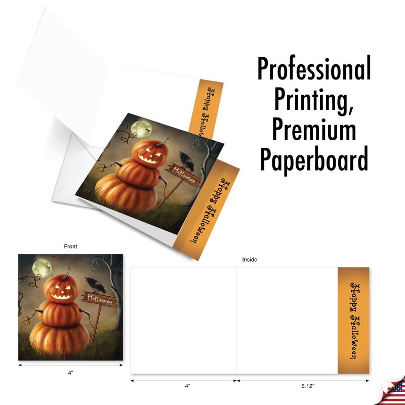 20 HAPPY HALLOWEEN CARDS WITH ENVELOPES (4 x 5.12 Inch) Celebrate this mysterious special occasion with our premium Halloween card selection. The perfect scary art featuring high definition images of spooky pumpkin heads with bright lit eyes that's sure to scare your luck recipients. Share the mystery of each fog filled card with the people you love. Order this wonderful selection today and receive it boxed and prefolded with envelopes for your mailing comfort and convenience. These high quality, good as gold cards are printed on-demand (and we are very demanding!) in North America - some made in the USA, others in Canada. Many of our fabulous, custom & colorful note cards are also available blank to appease one's closeted, creative urges. You are able to make these blank and generic, fold over cards more modern & unique for your work or office party, write personal messages, or draw cute & fancy pictures...There are merely 7,000 funny cards in the collection. Whether looking for a themed sports greeting card, bulk assortments, boxed notecard sets, or a specific life occasion, you're sure to find it. No matter which foldover, stationery notecard greeting you choose, we strive for perfection - every card, every order, every time. Are you thinking a lasting impression is important? – ORDER NOW!