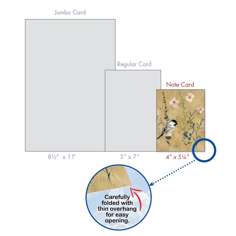 We offer a huge 8.5 x 11-inch jumbo size version of most of our designs and assortment packs of our most popular designs in just about any occasion and configuration. We also publish blank versions of many designs and assortments to be used as thank you notes, friendship, miss you, thinking of you or any other purpose or occasion you can think of.