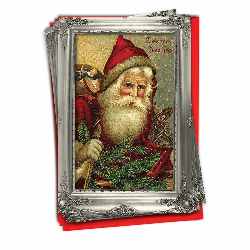 Celebrate this holiday season by giving homage to the beautiful works of art of the past. Our vintage style Christmas Card features a retro painted design at the front, silver lining that mimics the look of a picture frame in the outline, while at the center a hand painted photo of Santa Claus, carrying his bag of goodies loaded with different toys, snowflakes falling down as he marches along to deliver presents to all the children of the world. A great choice suitable for different individuals, you can never go wrong with the classics. This 12 pack is great if you need to send out multiple cards to friends, family or co-workers, the timeless design makes it capable of being well suited for any kind of personality. Our good as gold cards are printed on thick, snow white cardstock. All happy holiday notecards are made of recycled material (no papyrus, naturally). Our print on demand technology further reduces paper waste and environmental impact. The high gloss cover photo pops with quality and color, while the inside is matte, creating a smooth writing surface for your heartfelt, joyful Christmas notes. This Christmas season, reach friends, family, and coworkers living near or far, as every greeting card ships with a mailing envelope. Bulk notecard assortments and sets arrive in a reusable box. All boxed notecard sets are easily stored in a work office desk, ready to customize for your next life occasion. Some card designs and photos even look great framed, creating appealing wall art for your home. This year, leave a big impression on your recipient, no matter the occasion. There are beautiful designs, and funny greetings, waiting for you! Many family friendly options, including cute and adorable art for kids, adorn our greeting card covers.