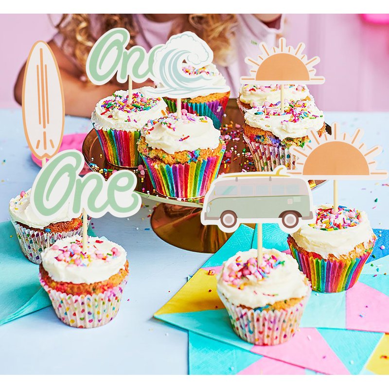 The Big One Cupcake Toppers, 1st Birthday Ocean Surf Cupcake Toppers,"ONE" Birthday Cake Decoration,Surf Bus Cake Topper,Swimming Beach Themed Party Ocean Baby Shower Party Supplies