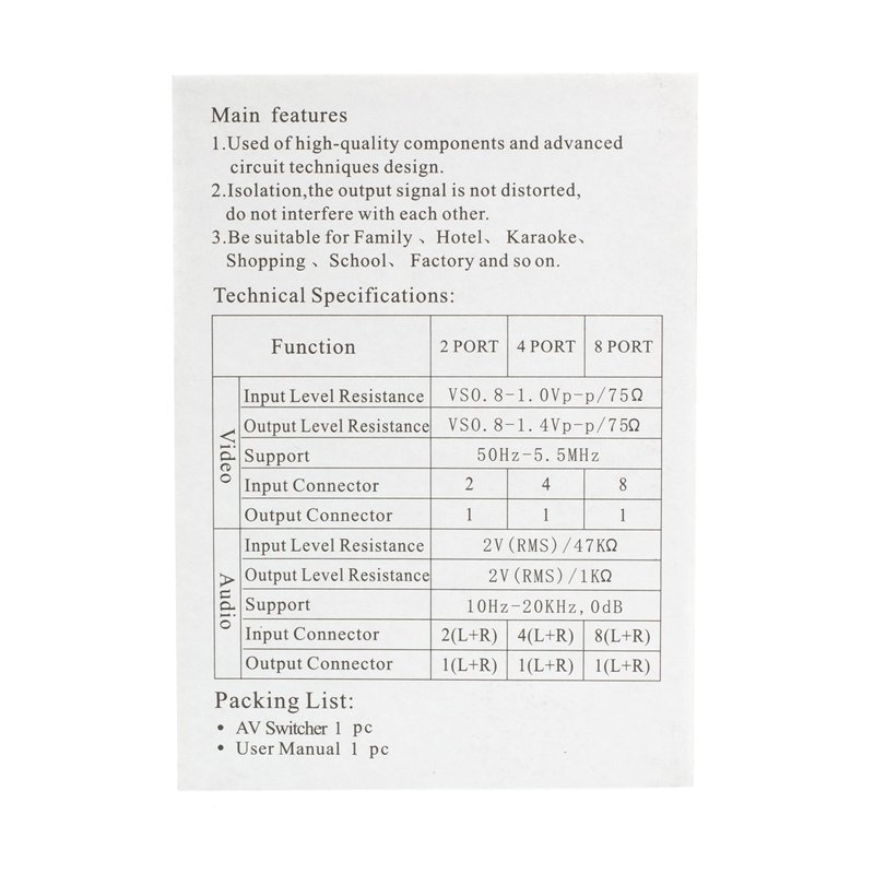 - A/V SPECS - Video - Input level Resistance - VS 0.8-1.0Vp-p/75ohm, Output level Resistance - VS 0.8-1.0Vp-p/75ohm Audio - Input level Resistance - 2V(RMS)/47Kohm, Output level Resistance - 2V(RMS)/1Kohm